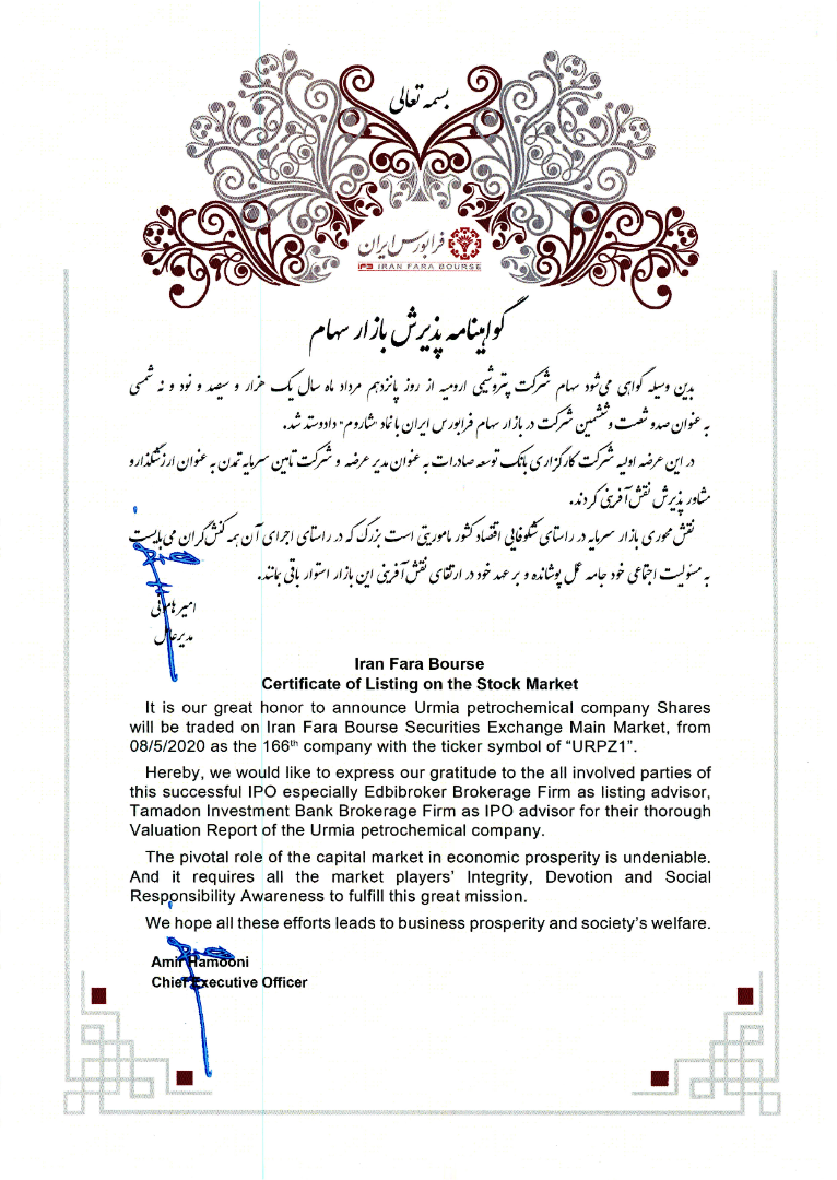 گواهینامه پذیرش پتروشیمی ارومیه در بازار سهام