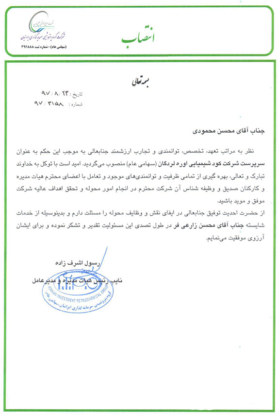 به موجب این حکم آقاي محمودي به عنوان سرپرست شرکت كود شيميائي اوره لردگان منصوب گردید